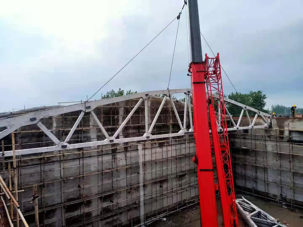 5#平房仓的仓顶由16榀预应力屋架梁和400块屋面板构成,每榀预应力屋架梁重14.24吨,长度达30米,平房仓的工作重点是预应力屋架梁的制作及吊装,工作难度大、技术含量高,项目部紧抓屋架梁预制这道关键工序,提前谋划,做好准备。